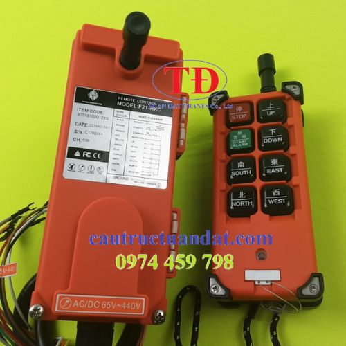 Thiết bị điều khiển từ xa F21-RXC 65-440V gồm có bộ thu sóng và bộ phát sóng, bộ phát sóng (tay bấm điều khiển) có 6 nút điều khiển 1 cấp tốc độ và nút Start/ Stop.